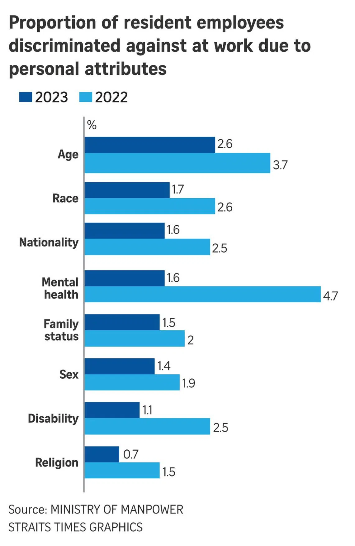 However, employees are still apprehensive about seeking help after experiencing discrimination, said MOM. Fewer resident employees or 29.3 per cent of those who faced discrimination at work sought help in 2023, compared with 35.3 per cent in 2022.