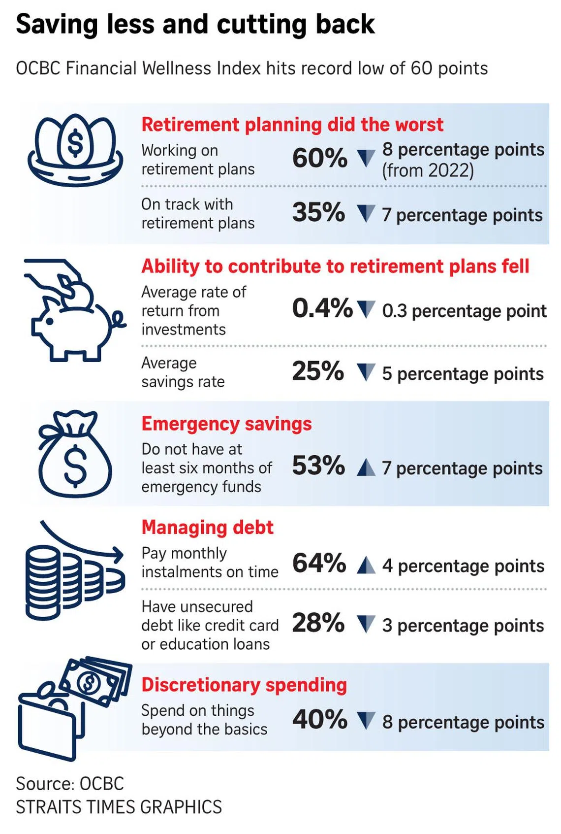 OCBC uses the study to compile a Financial Wellness Index, which has fallen for the second straight year, and now sits at 60, the lowest score since its inception in 2019.