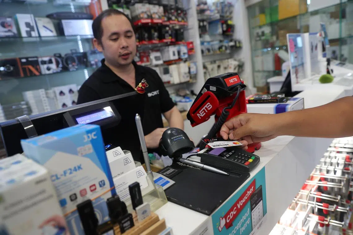 A customer paying with Nets at MS Color Service on July 11, 2023.