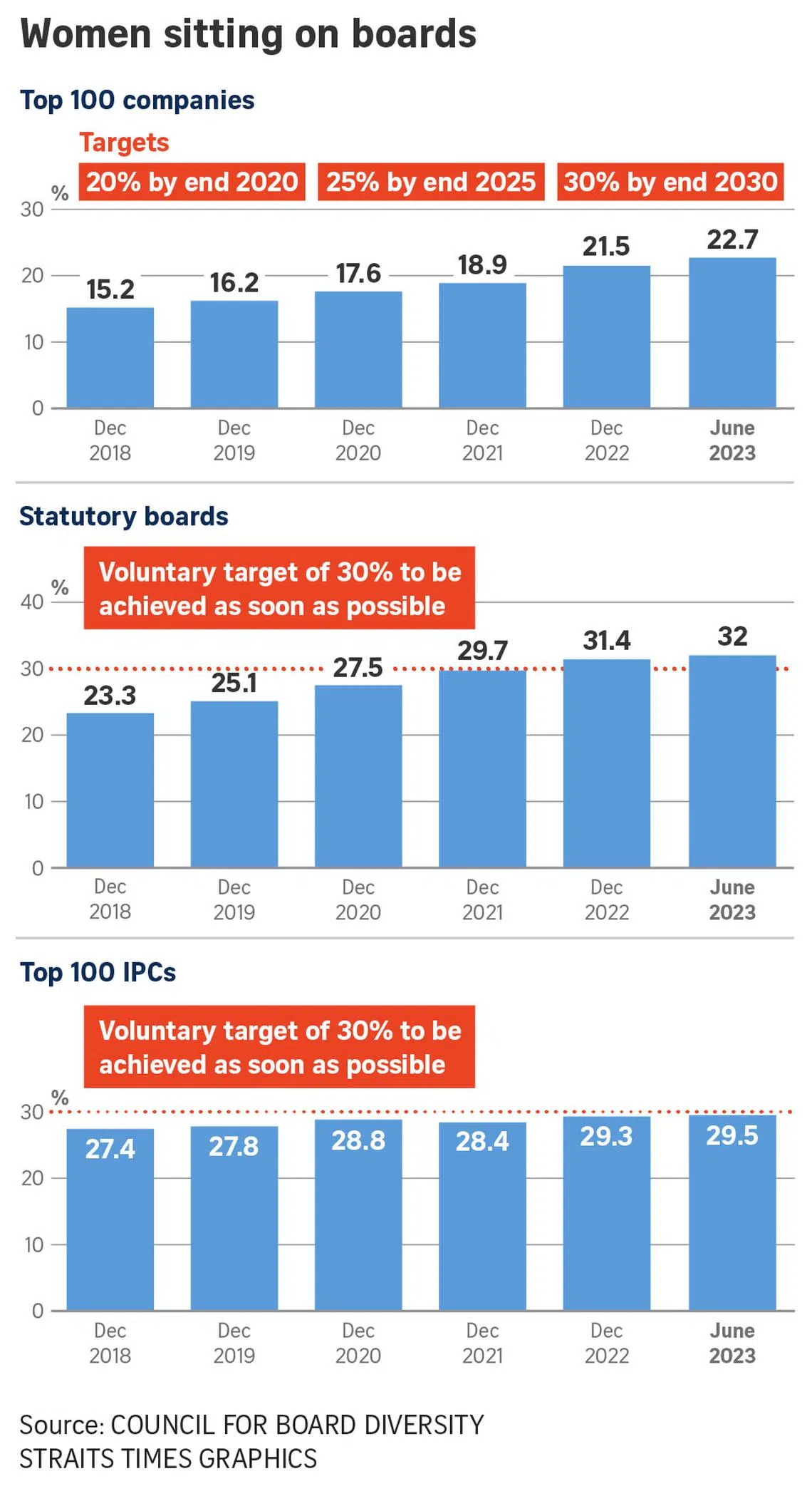 In the public sector, the proportion of women having a board seat at statutory boards in Singapore hit 32 per cent in June 2023. Statutory boards were the first of the three sectors to hit their voluntary target of 30 per cent in 2022.