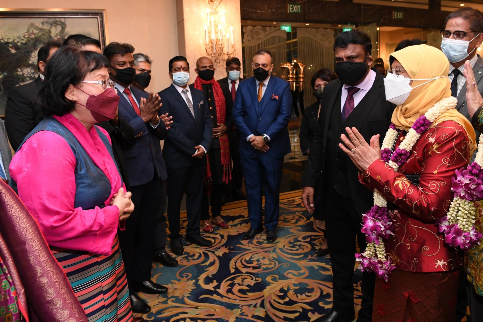 President Halimah Yacob greeting Singapore Indian Chamber of Commerce and Industry director Shobha Tsering Bhalla at a gala dinner.
