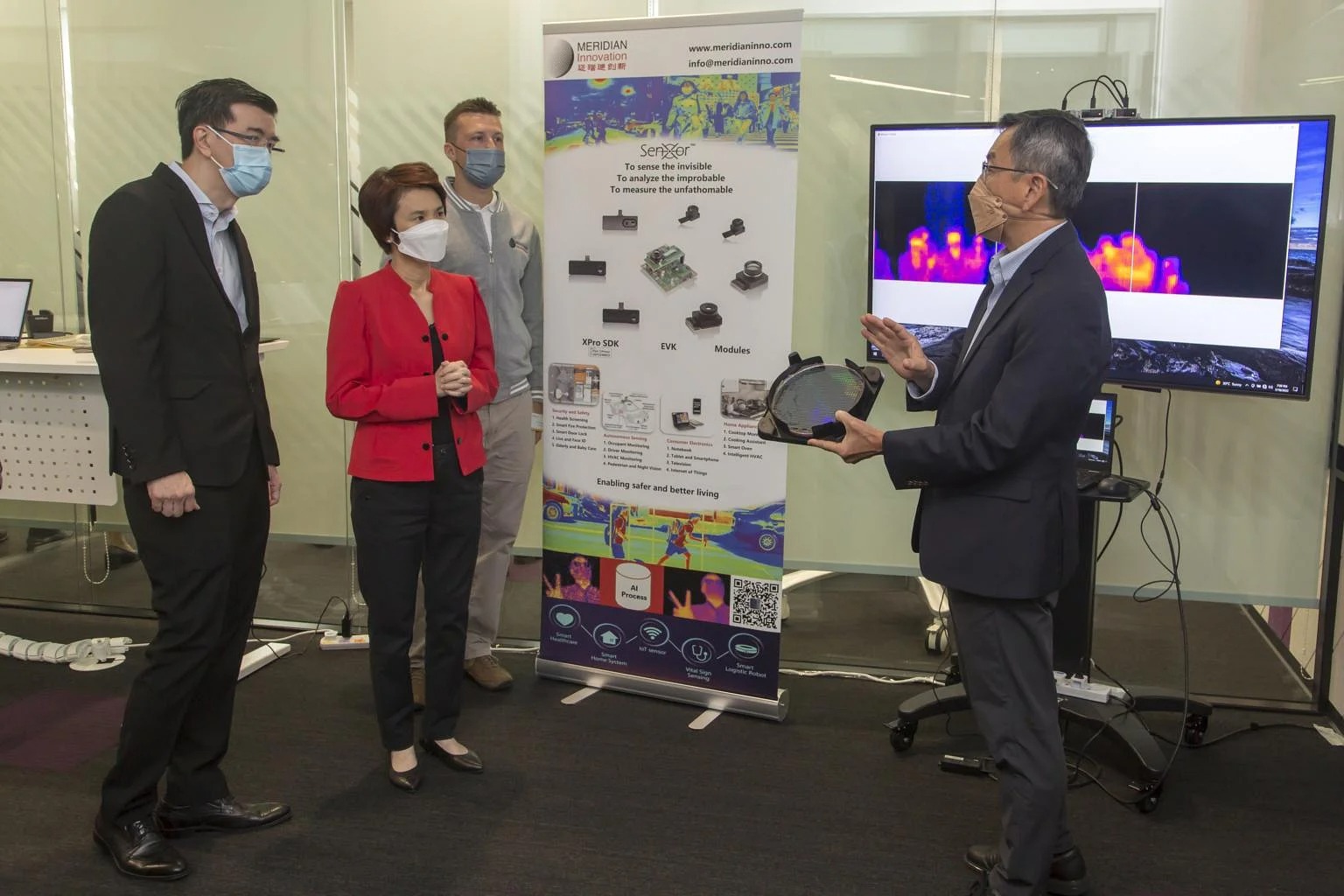 Meridian Innovation CEO Hock Leow (right) speaking with Minister of State for Trade and Industry Low Yen Ling and Continental Automotive Singapore president Lo Kien Foh (left) at the launch of co-pace on July 19, 2022. With them is Meridian Innovation vice-president Piotr Kropelnicki.