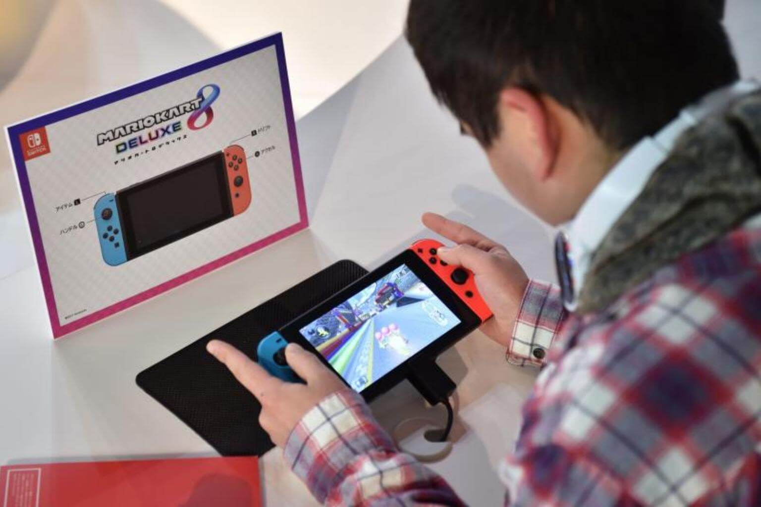 A visitor playing Nintendo's new Switch game console during its game experience session in Tokyo.