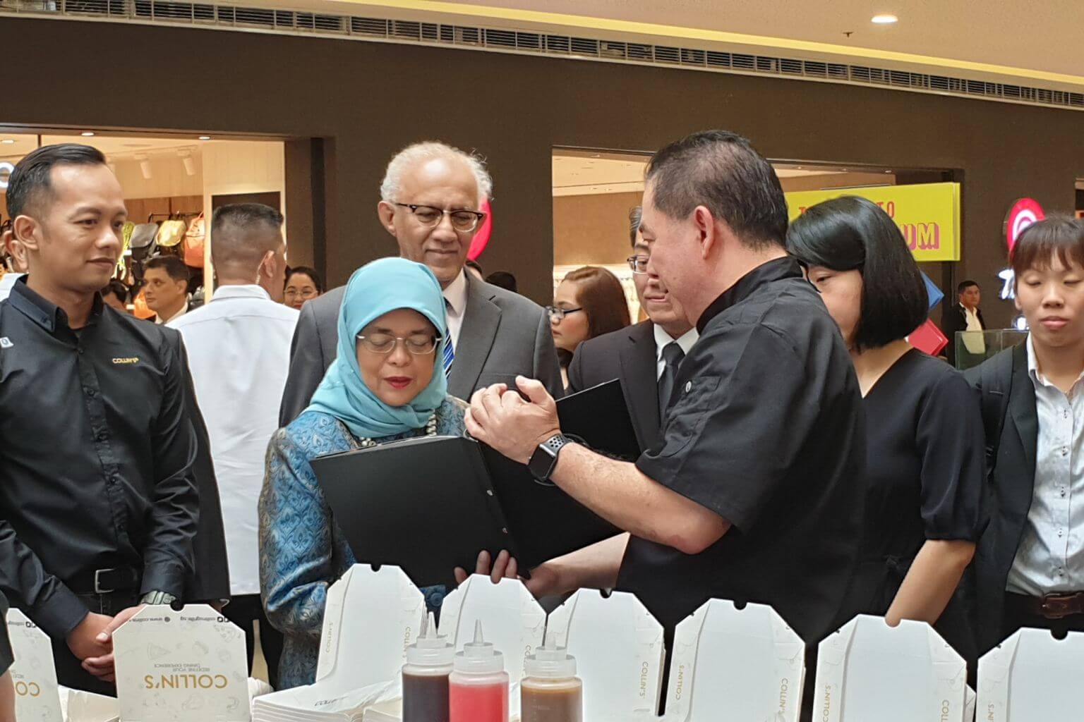 President Halimah Yacob interacts with staff from Collin's, a Singapore food and beverage chain that is exhibiting its products at Singaporium, a consumer and lifestyle pop-up in Manila.