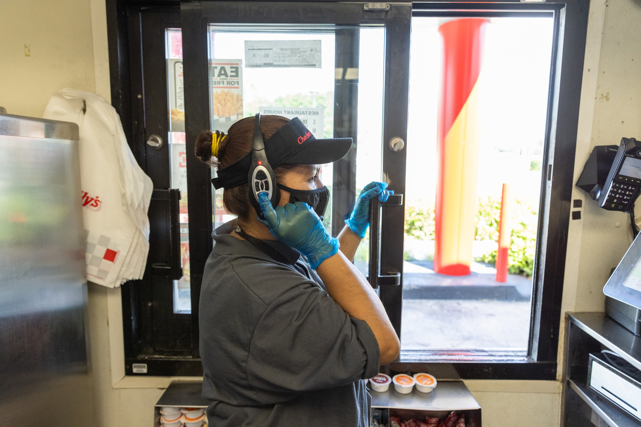 A Checkers employee takes an order via a voice-recognition robot in Georgia on June 30, 2021.