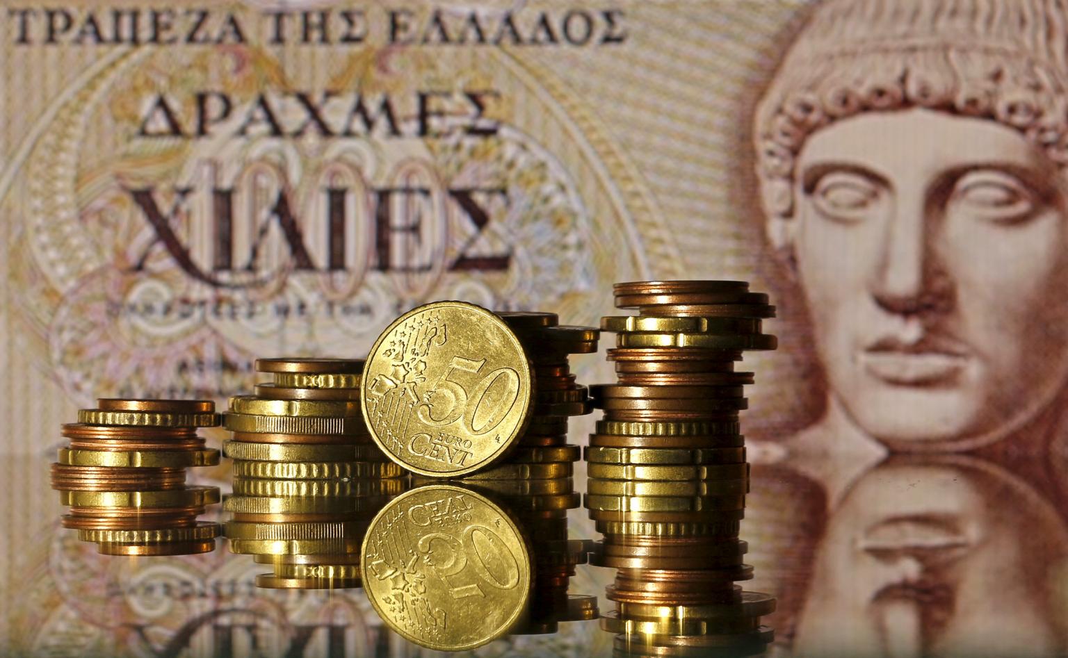 Euro coins are seen in front of an old 1,000-drachma note which shows the head of Apollo.
