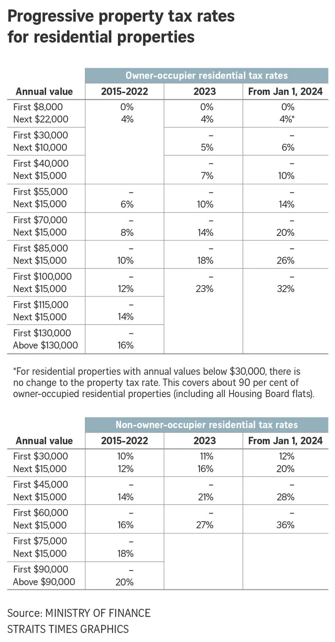 SINGAPORE - Property taxes for most home owners will go up in 2024 because of higher market rents and annual values for most residential properties, as well as an increase in property tax rates for higher-value private homes.