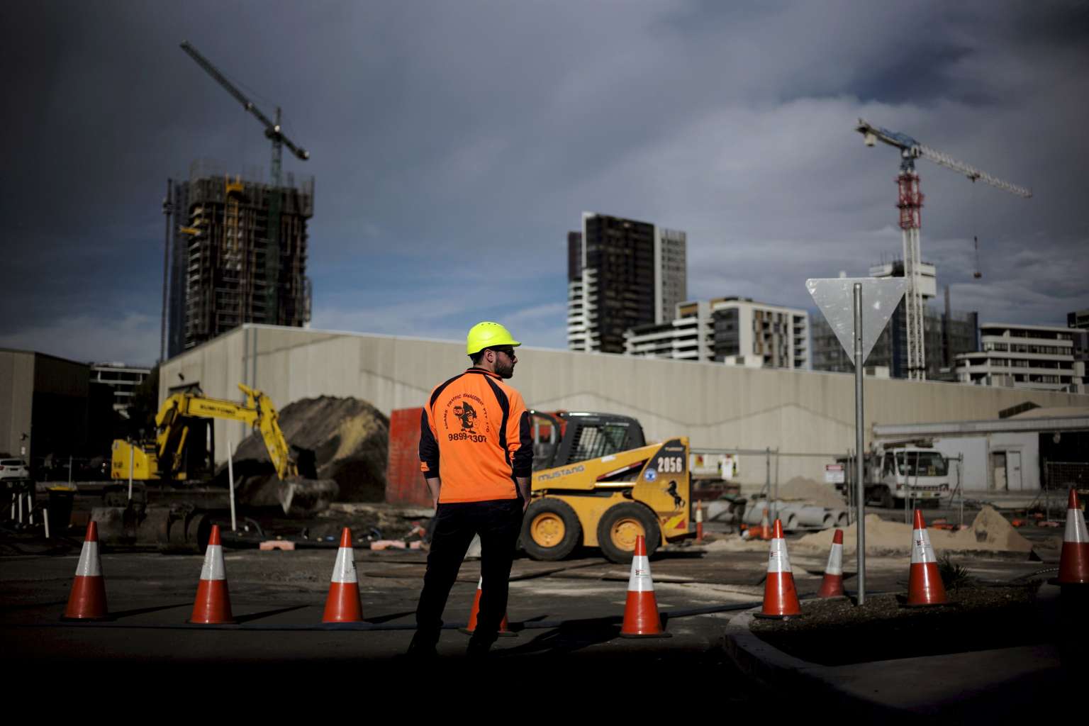 A worker standing in front of a construction site for new apartment blocks in Sydney on June 24, 2015.