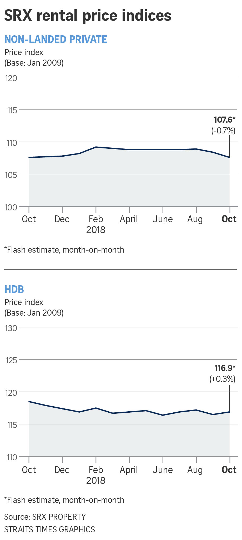 Rents for condominiums and private apartments dropped for a second straight month, slipping 0.7 per cent in October from the previous month. This came after rents dipped 0.5 per cent in September, with the figure revised by SRX from a 0.4 per cent decline.