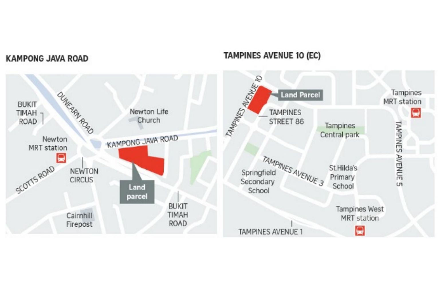 The Kampong Java Road plot spans 11,643.3 sq m, with a maximum gross floor area (GFA) of 32,602 sq m, while the Tampines Avenue 10 site spans 24,938.7 sq m, with a maximum GFA of 69,829 sq m.