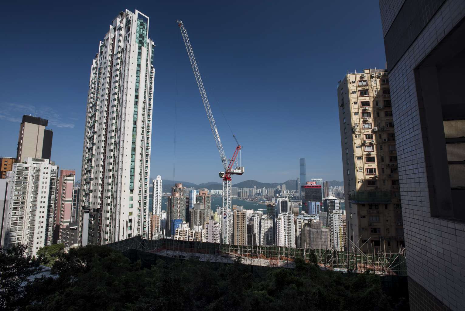 A crane operates next to residential buildings in the Mid-Levels area of Hong Kong.