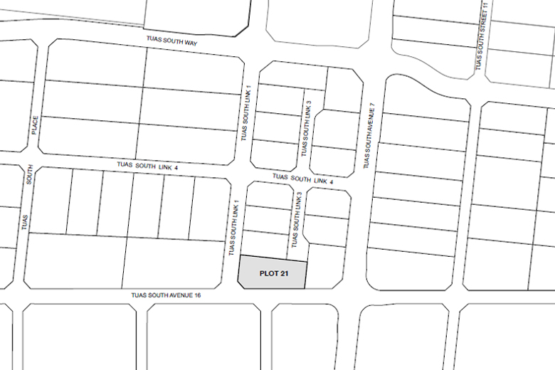 Located along Tuas South Link 3, Plot 21 is a 0.78 hectare or 7,831.6 square metre site zoned for Business-2 development and has a 20-year tenure with a maximum permissible gross plot ratio of 1.4.