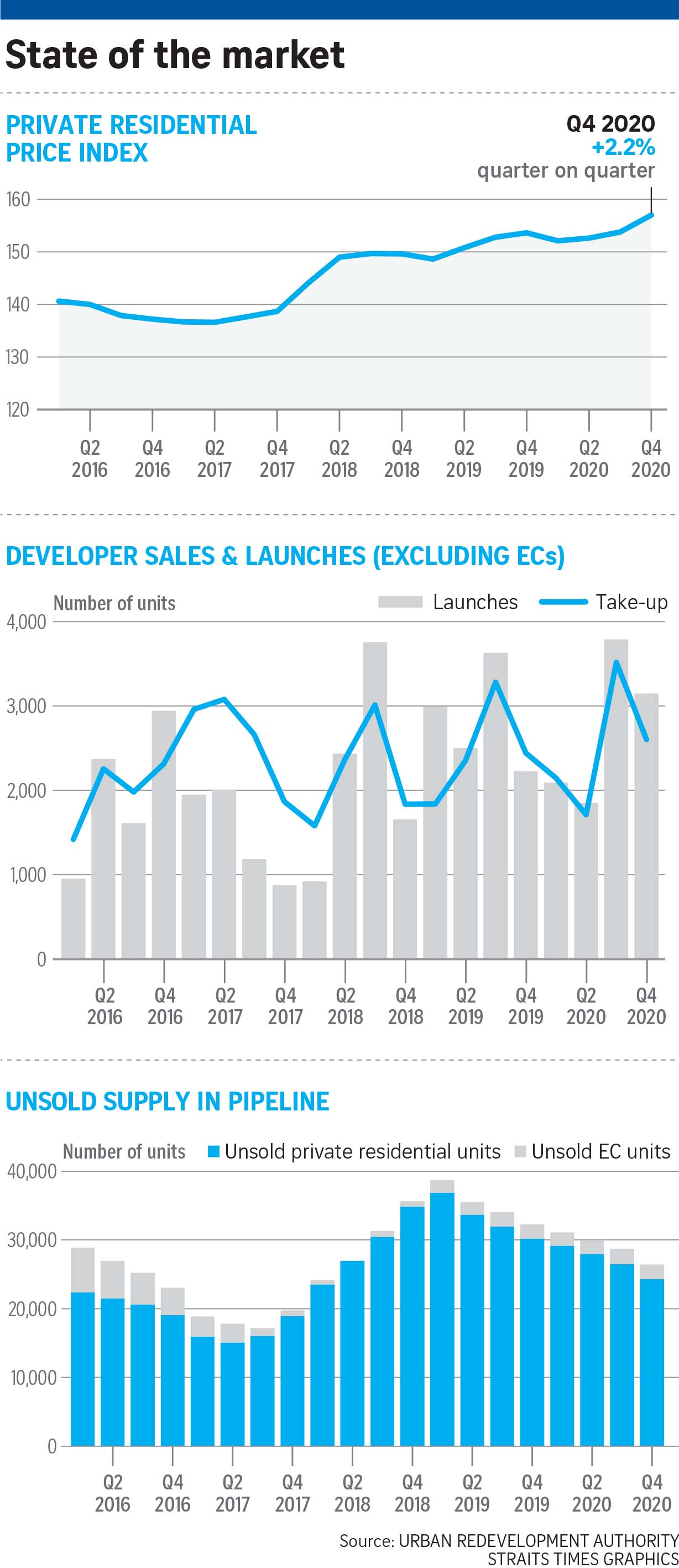 Developers launched 10,833 uncompleted private homes for sale last year compared with 11,345 in 2019 with 3,147 of those coming in the fourth quarter, a slight fall from the previous three months. There were 49,307 uncompleted private homes (excluding ECs) in the pipeline with planning approvals as at the end of the fourth quarter, compared with 50,369 in the previous quarter.