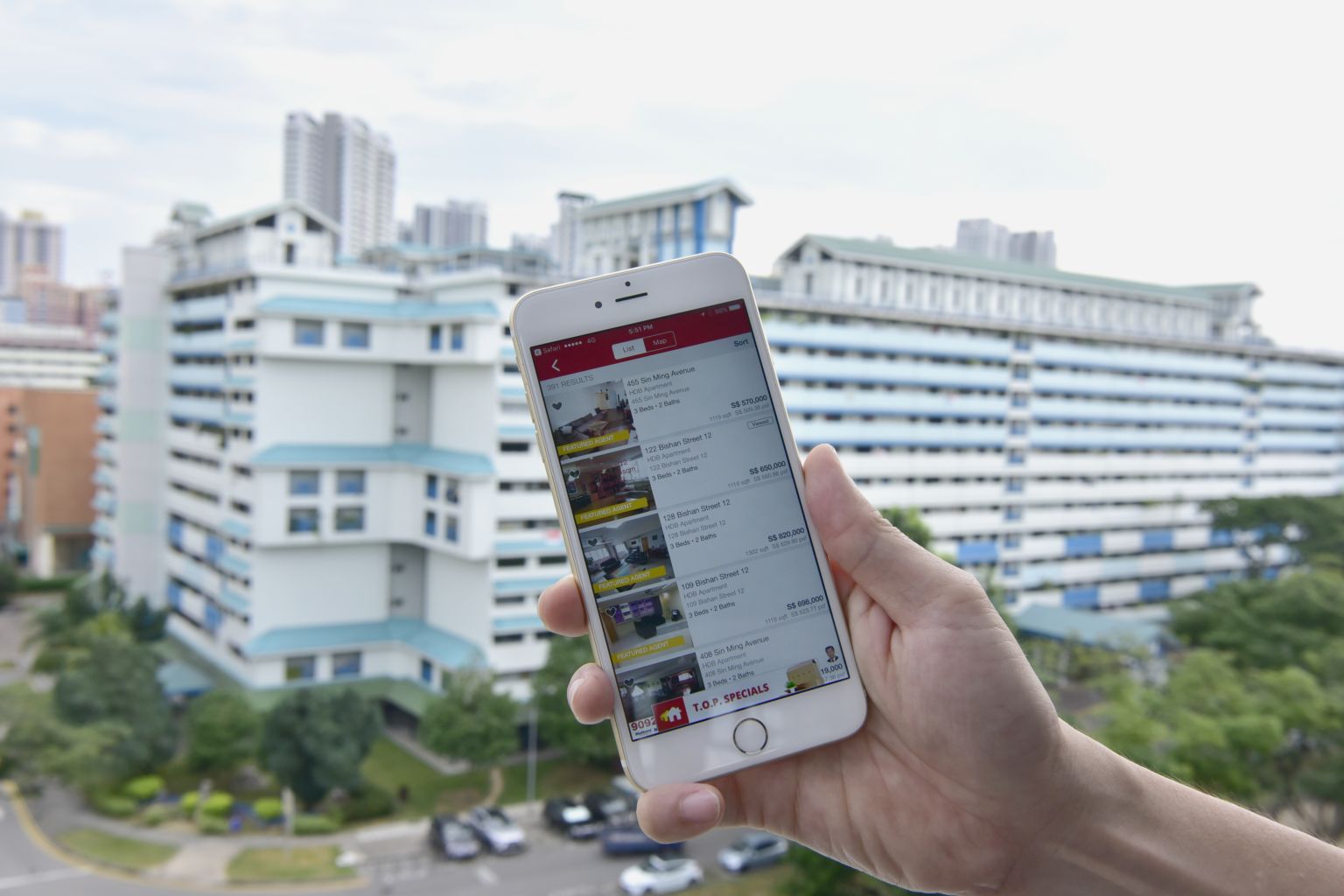 A photo taken in 2017 showing the PropertyGuru app on a smartphone with HDB flats in the background.