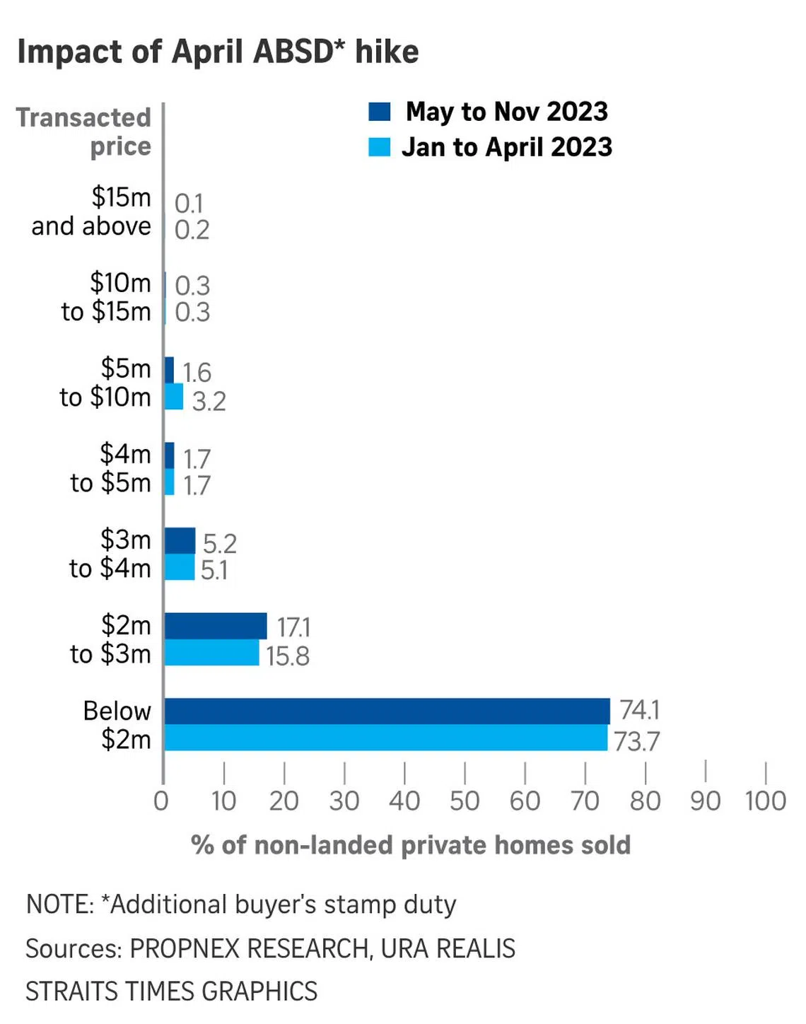 “Overall, we would expect the punitive ABSD rate for foreigners to weigh on the sales of high-end homes,” said Ms Wong.