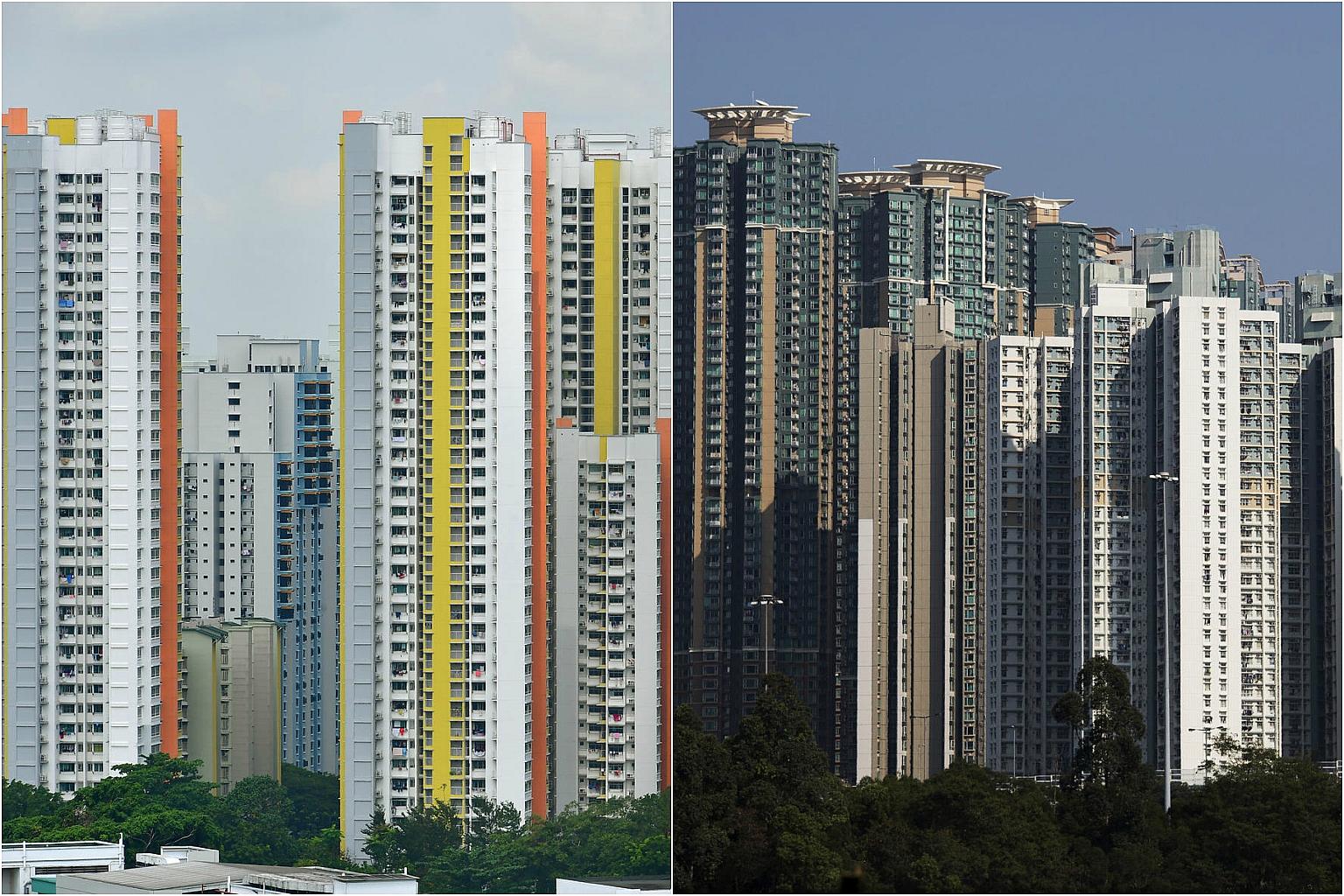 HDB flats in Singapore (left) and residential buildings in the Lai Chi Kok district of Hong Kong.