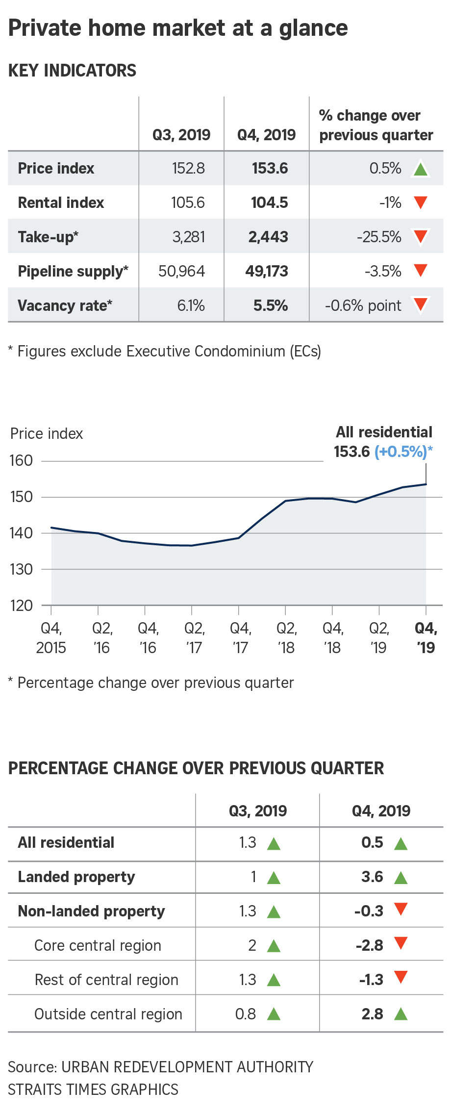 For the whole of 2019, prices of landed homes rose 5.7 per cent while those of non-landed properties went up by 1.9 per cent.