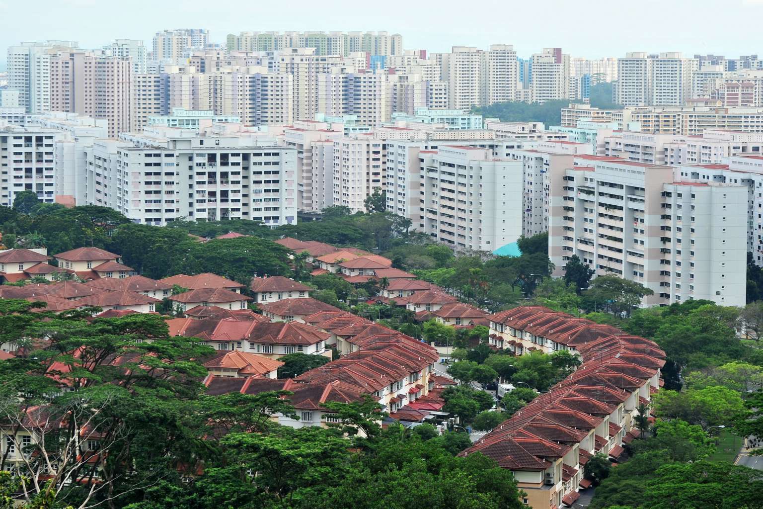 Aerial view of private residences and HDB flats near Tree House condominium.