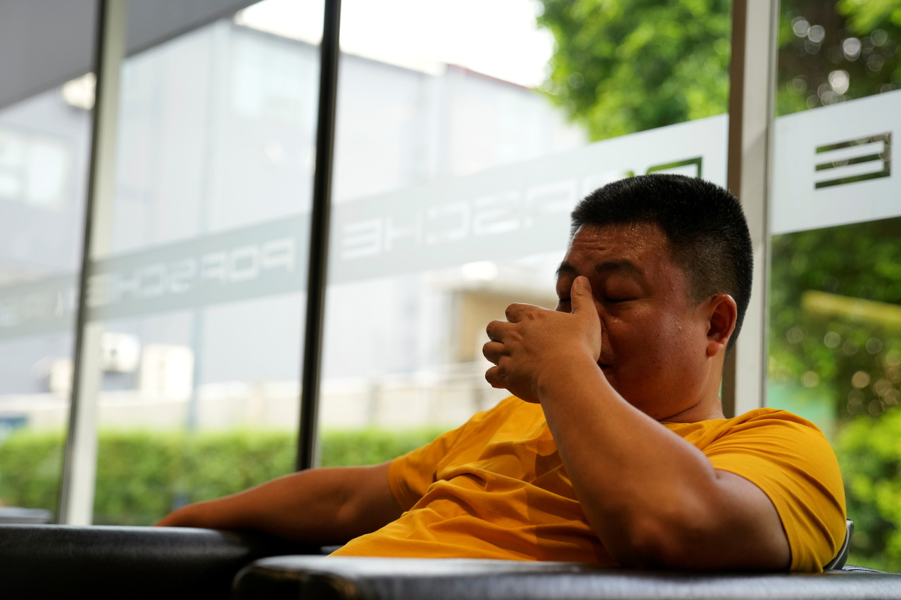 Guo Hui reacts as he waits at a car dealership to sell his Porsche Cayenne in order to pay his debts, in Guangzhou, on Sept 27, 2021.