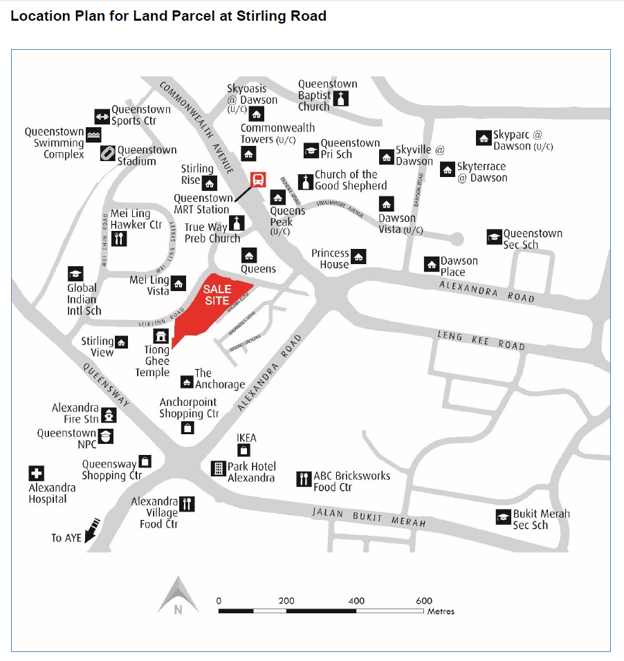 The land parcel at Stirling Road in Queenstown was triggered for sale after a developer committed to bid at no less than S$685.25 million. That bid translates to S$718 per square foot per plot ratio based on the site's maximum gross floor area of 88,660 square metres.
