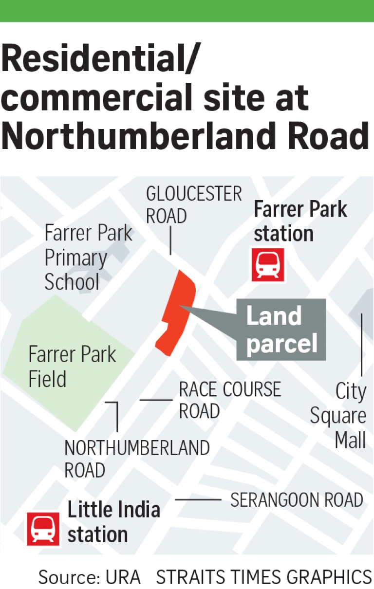 URA put up the Northumberland Road site near Farrer Park for sale via public tender. The 99-year leasehold plot is zoned residential with commercial on the first storey and spans 8,733 sq m.