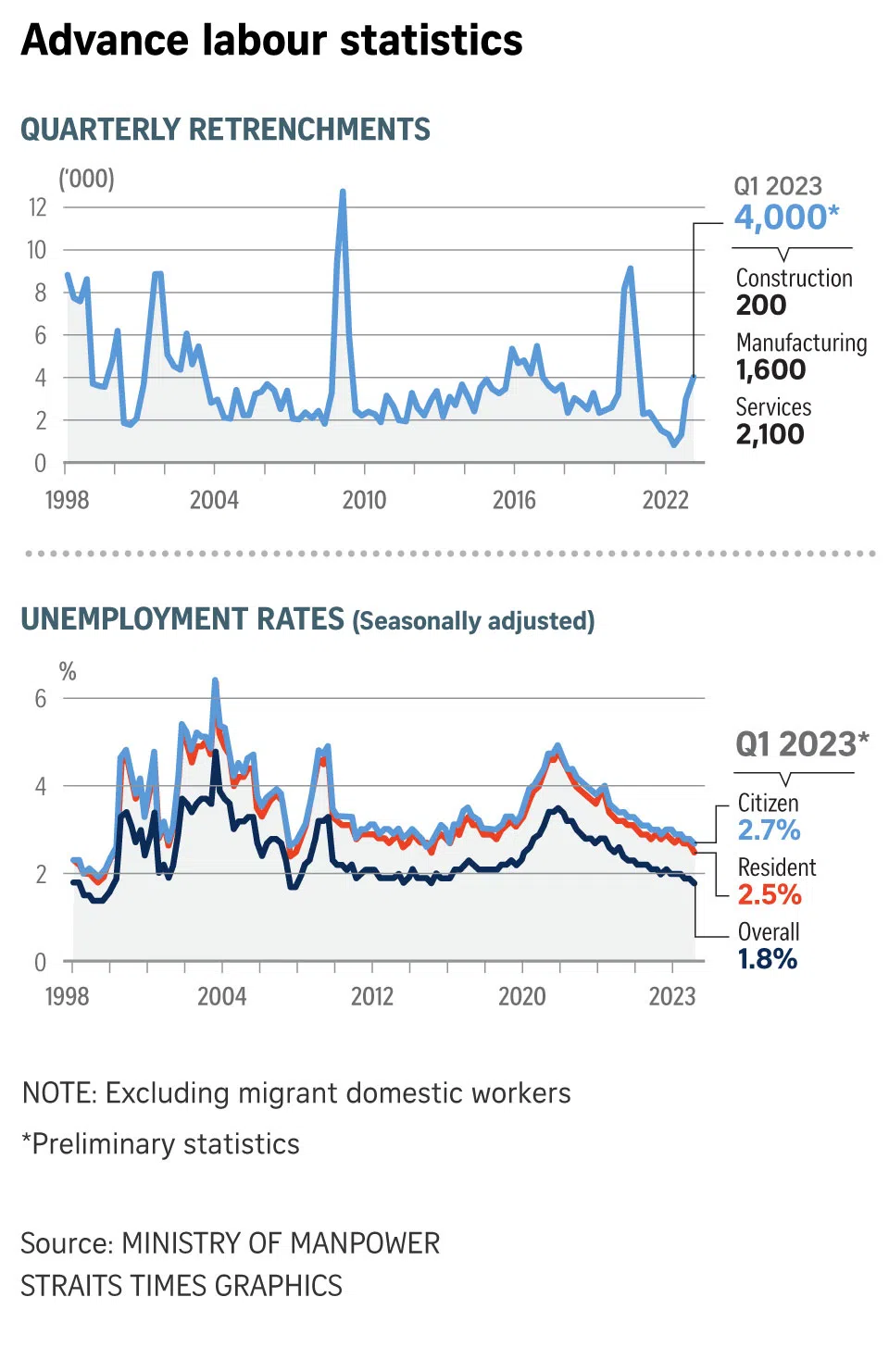 Retrenchment numbers in Singapore up in Q1 of 2023, but overall unemployment numbers fall