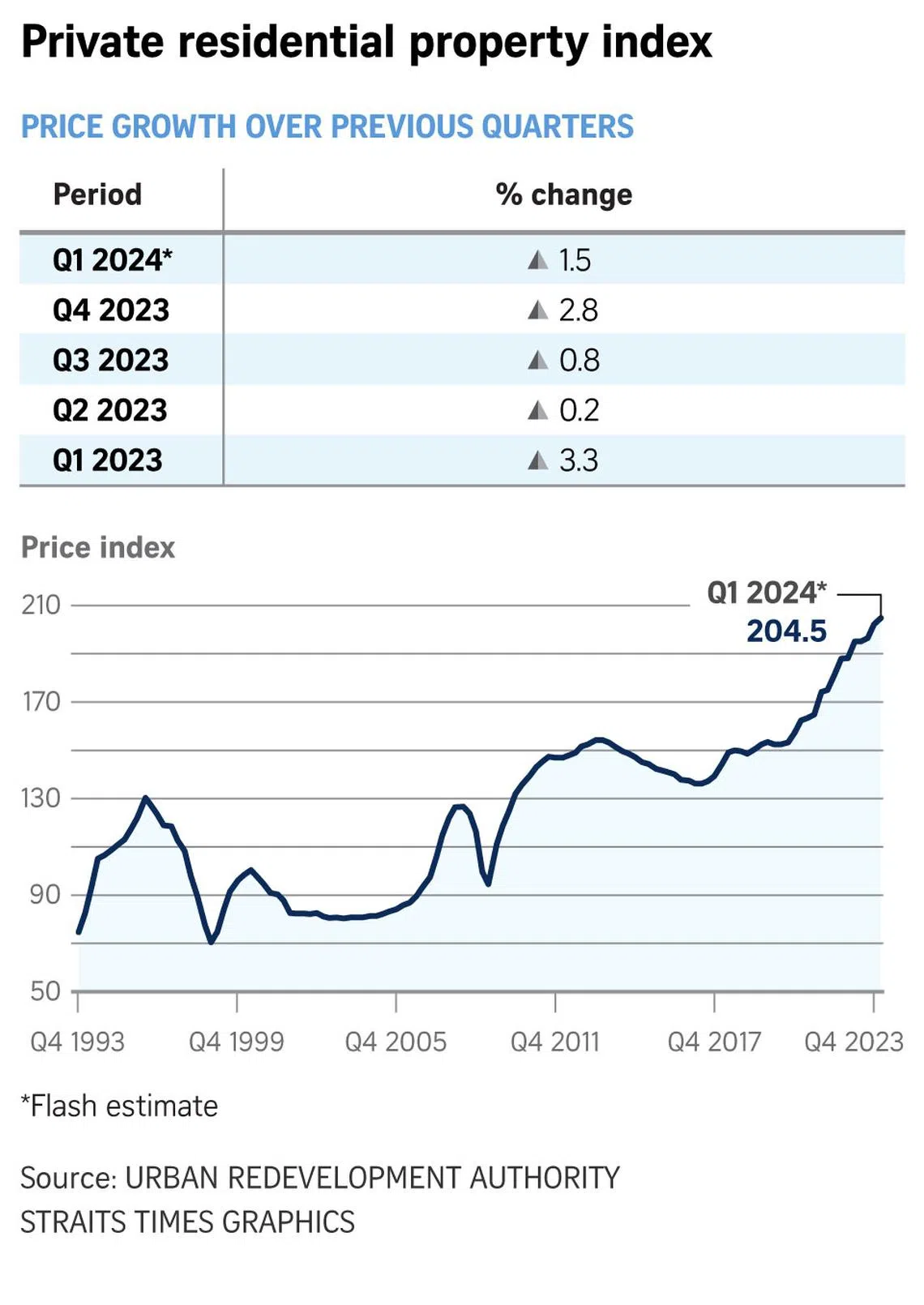 Between January and March, private residential property prices rose 1.5 per cent, after a 2.8 per cent gain in the fourth quarter of 2023, according to Urban Redevelopment Authority (URA) flash estimates released on April 1.
