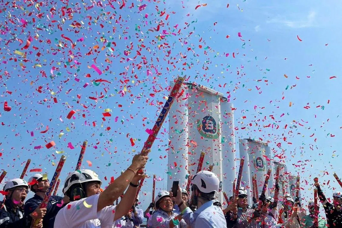 Employees and clients of Berge Bulk celebrating the unveiling of the bulker ship Berge Olympus, in Singapore, on Oct 12.