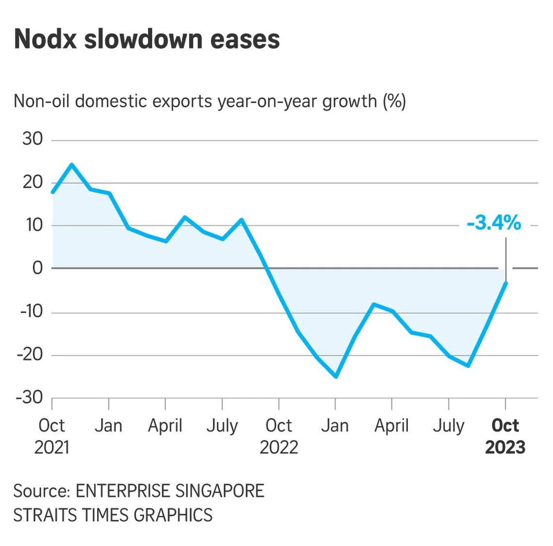Non-oil domestic exports (Nodx) fell 3.4 per cent in October from the same month a year ago, according to data released by trade agency Enterprise Singapore (EnterpriseSG) on Nov 17.