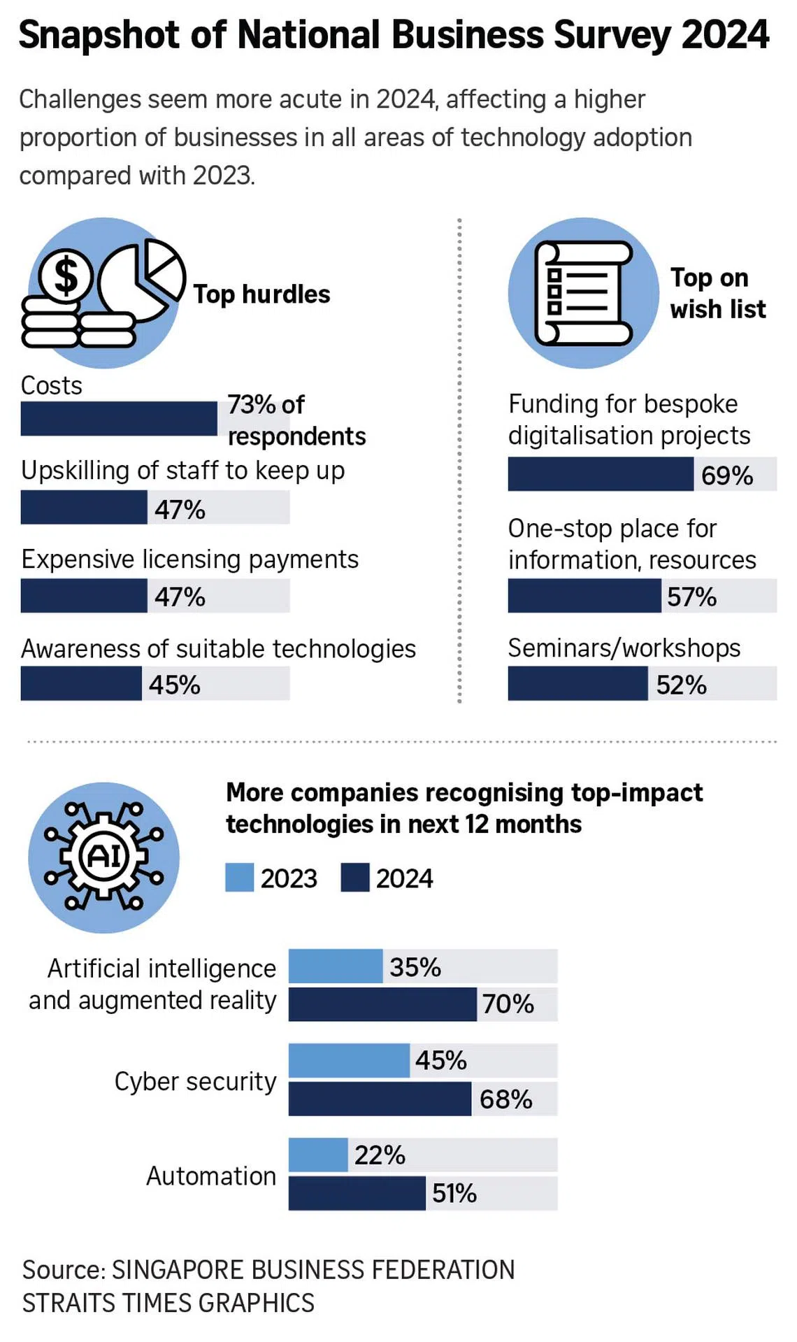 Tech adoption challenges also seem more acute in 2024, as all varieties of challenges in technology adoption are highlighted by a larger proportion of businesses compared with 2023, added Mr Kok, who was speaking at the release of the survey.