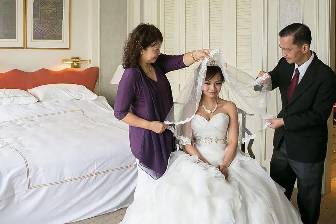 Ms Evelyn Quek, 36, with her parents in 2016. Her mother is also an insurance agent.