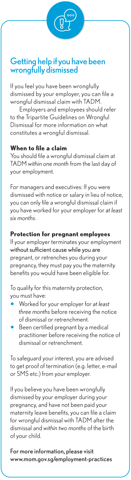 After hearing Ms Chan's case, the TADM advisory officer assured her that the company would not be able to escape its responsibility as an employer by simply terminating her without any basis, especially since she was pregnant. The officer patiently assisted Ms Chan to file a wrongful dismissal claim and arranged a mediation session with her former employer.