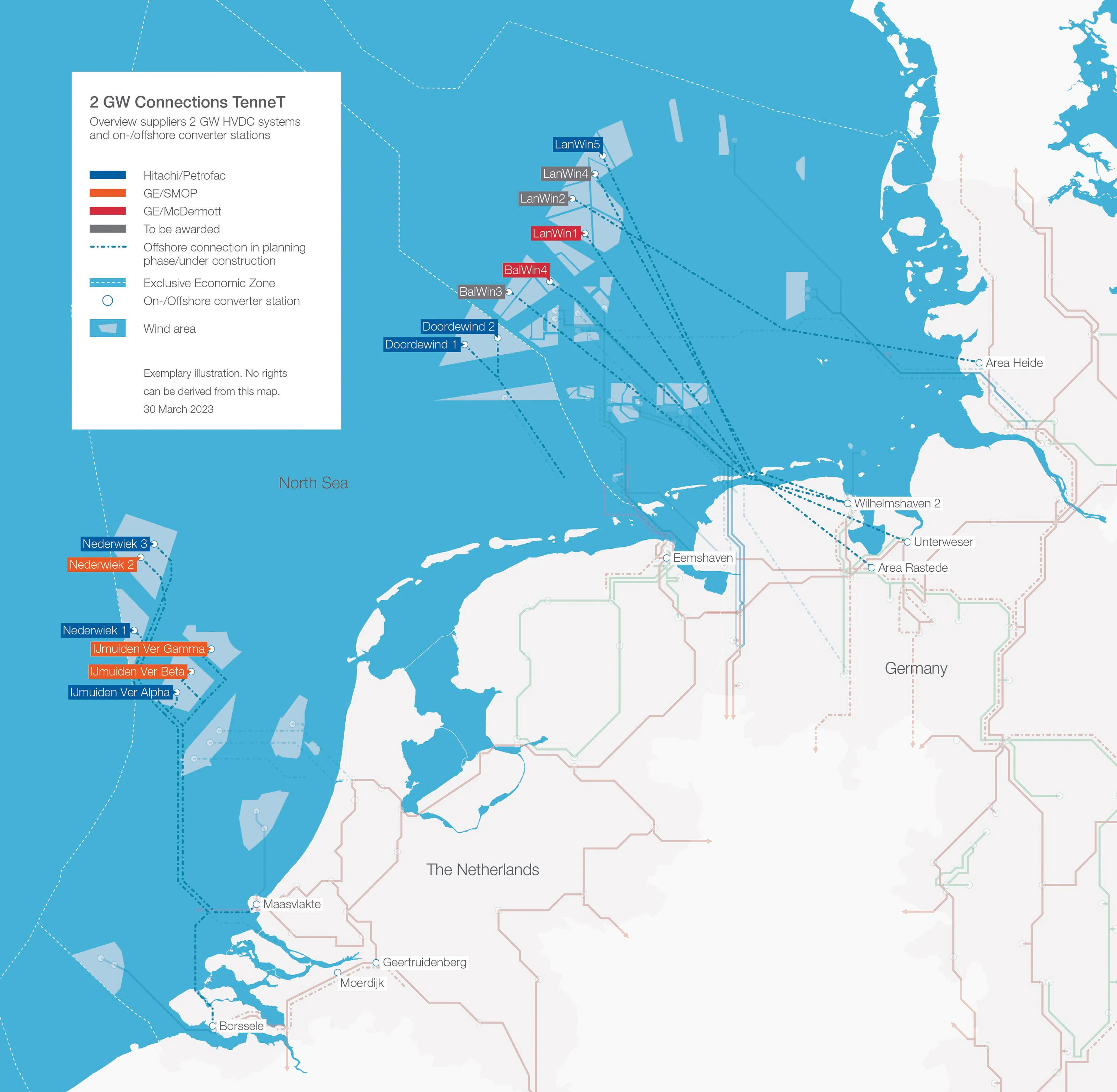 Overview of TenneT’s 2GW connections and HVDC wind farm projects in its offshore grid development programme.