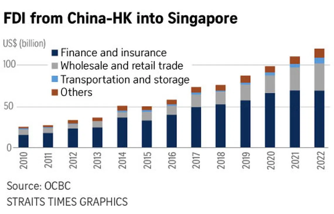 Mainland China and Hong Kong’s share of the total FDI into Singapore has been rising in recent years, from almost US$52 billion in 2015 to US$113.2 billion at the end of 2022.