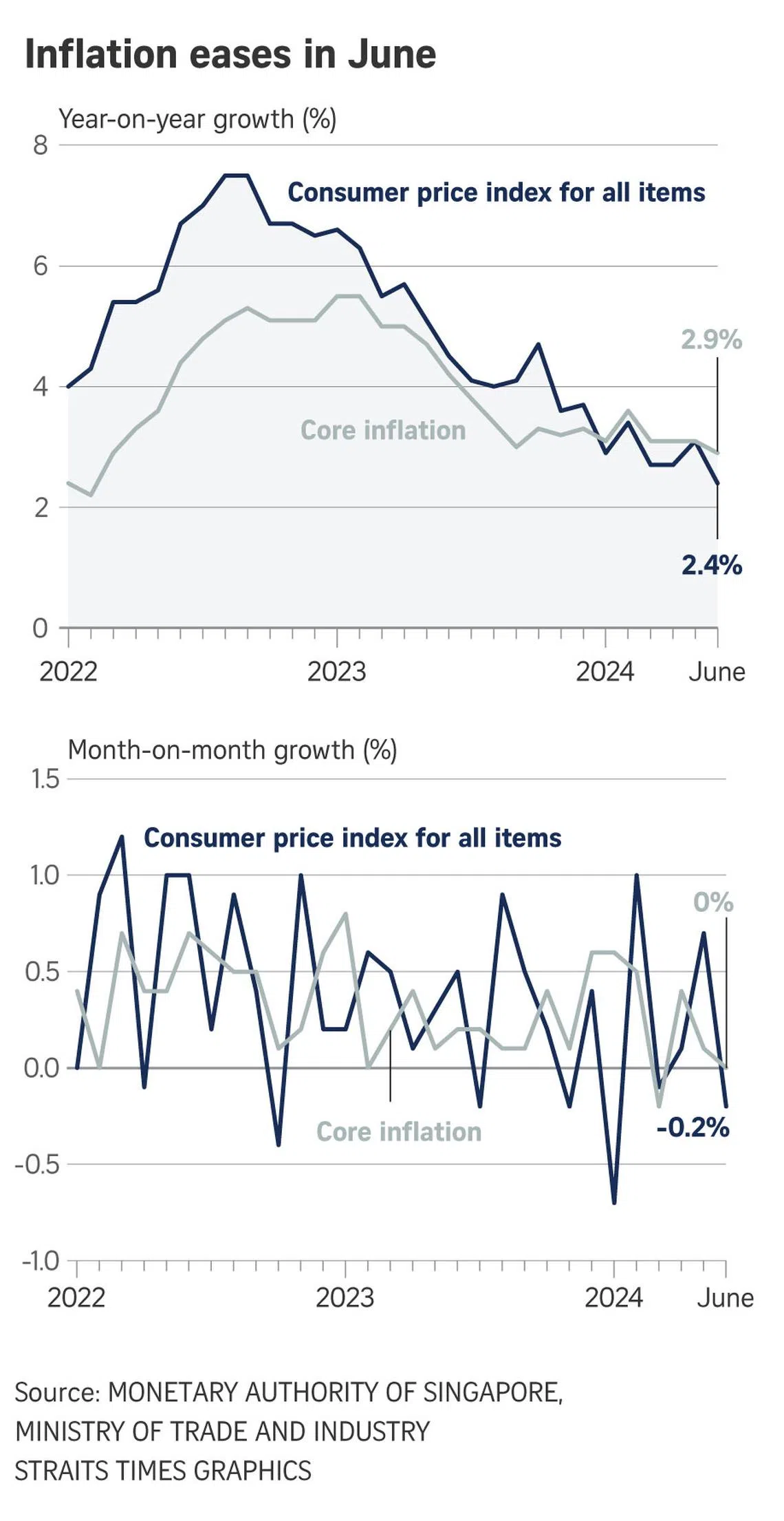 DBS economist Chua Han Teng said the softer core inflation number in June reinforces expectations that the underlying core disinflation or reduction in the rate-of-inflation trend remains intact.