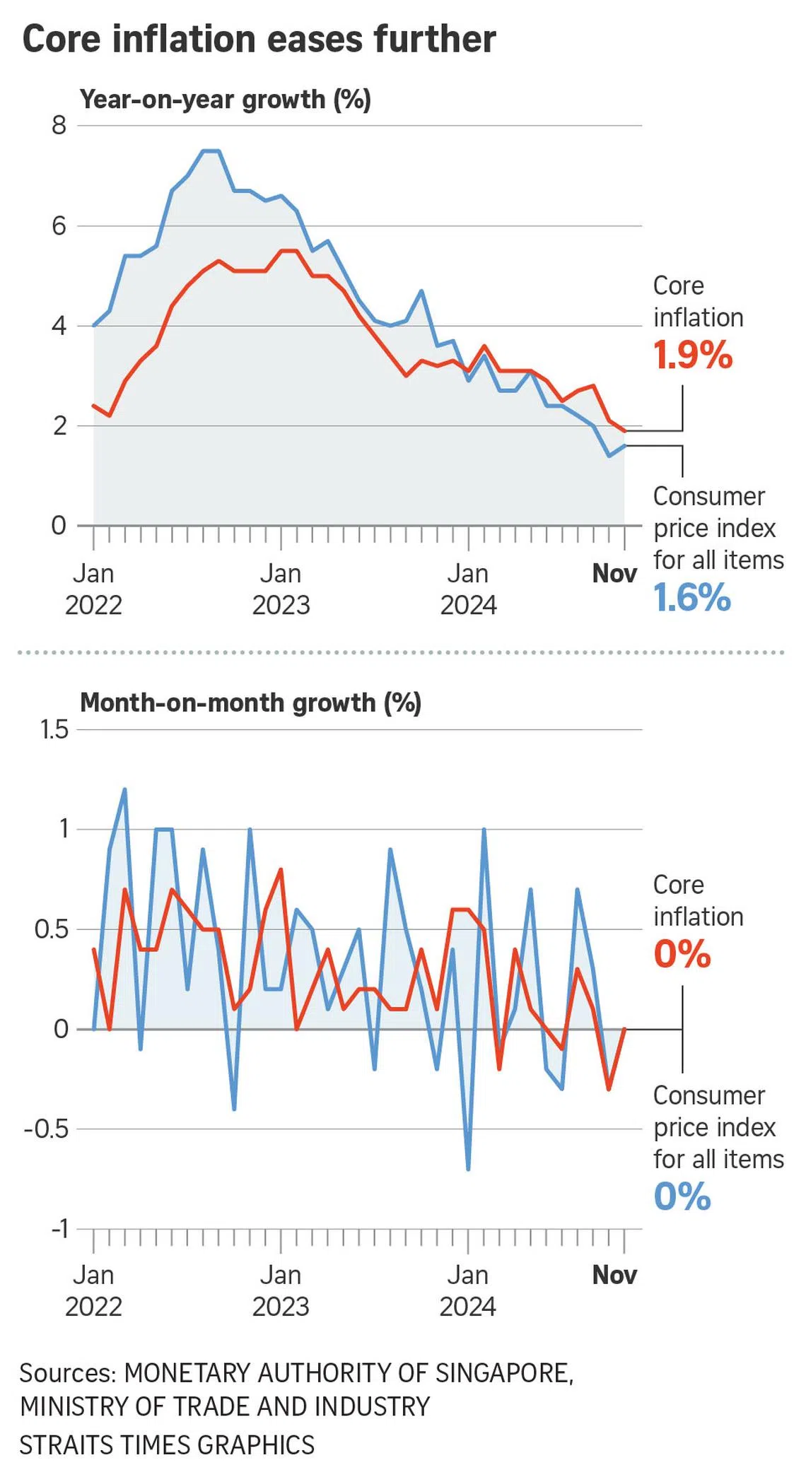 Core inflation, which strips out private transport and accommodation costs to better reflect the expenses of households here, fell to 1.9 per cent year on year, from 2.1 per cent in October.