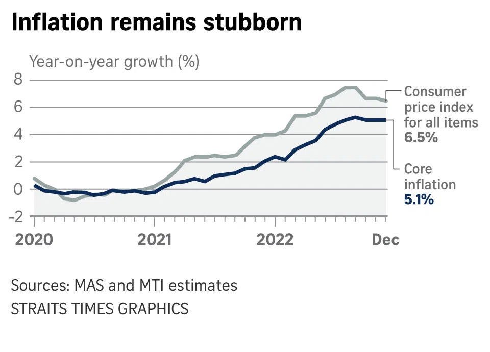 Core inflation is projected to stay high in the first half of 2023, before slowing more discernibly in the second half as the current tightness in the domestic labour market eases and global inflation moderates, MAS and MTI said.