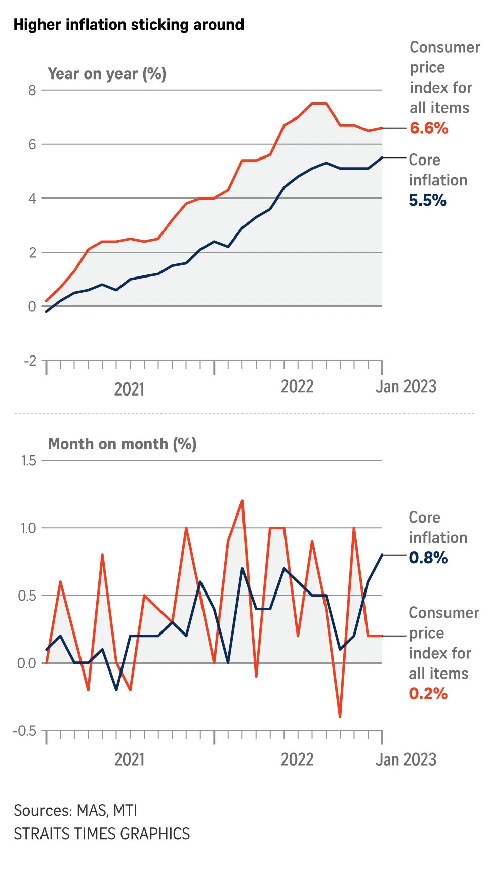 Finance Minister Lawrence Wong said in his Budget speech last week that he expected headline inflation to remain high for the first half of 2023, and announced an additional $3 billion in subsidies to help Singapore households cope with the higher cost of living.