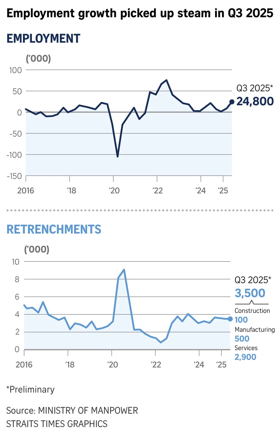 SINGAPORE – The number of people with jobs surged in the third quarter of 2025, as employment growth picked up steam and retrenchment rates remained stable.