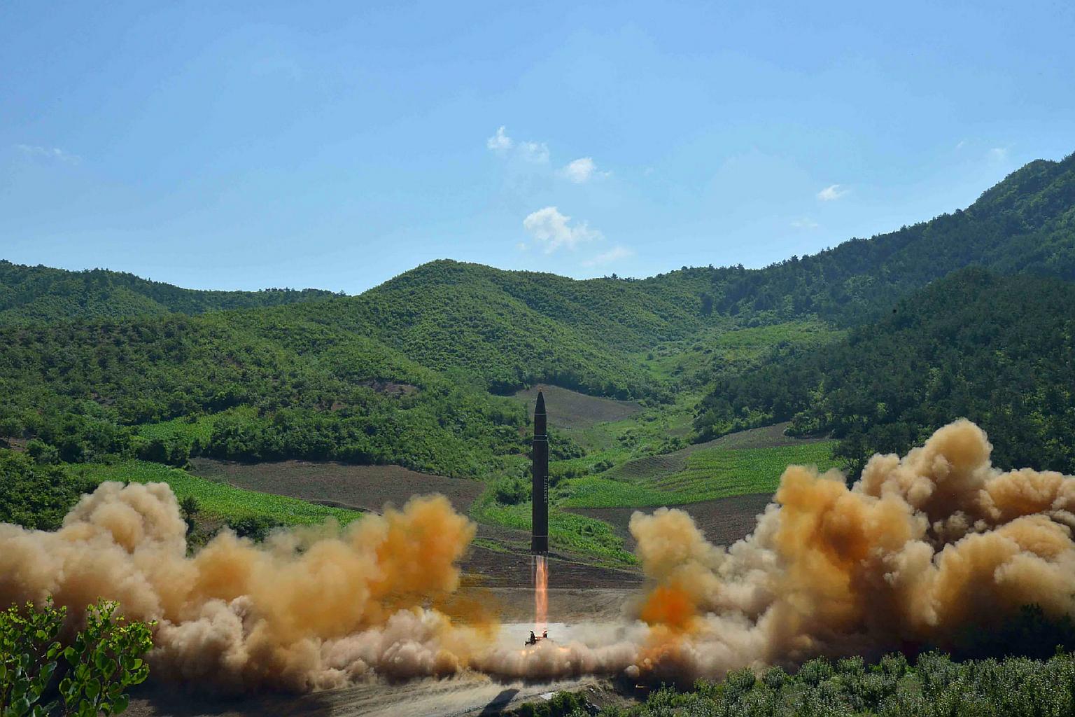 This picture taken and released on July 4, 2017 by North Korea's official Korean Central News Agency (KCNA) shows the test-fire of the intercontinental ballistic missile Hwasong-14 at an undisclosed location.