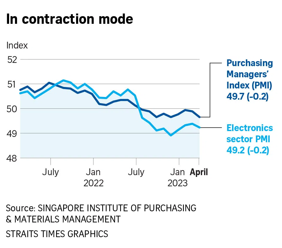 UOB senior economist Alvin Liew said the worsening electronics down cycle and weaker external demand are unlikely to change soon. He added: “We still expect PMIs for Singapore to remain in contraction territory and the weakness may linger... while a second-half recovery is far from certain.”