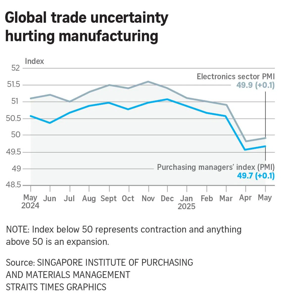 The PMI for the electronics sector – which accounts for about 40 per cent of Singapore’s manufacturing output – edged up 0.1 point in May from the previous month to post a slower contraction at 49.9 points.