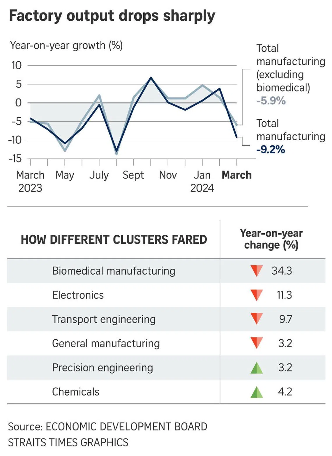 Excluding the more volatile biomedical industry, production dropped 5.9 per cent, data released by the Economic Development Board (EDB) on April 26 showed.