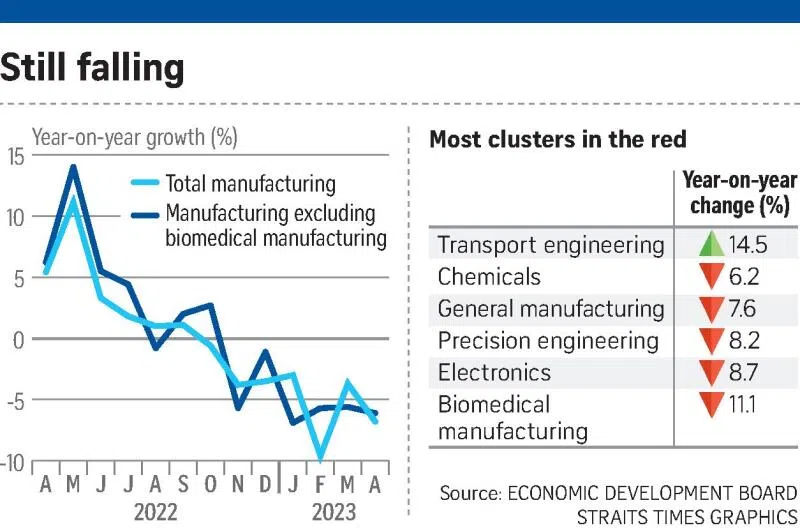 The linchpin electronics cluster, which accounts for 45 per cent of Singapore’s export-driven manufacturing sector, saw output drop 8.7 per cent in April from a year ago.