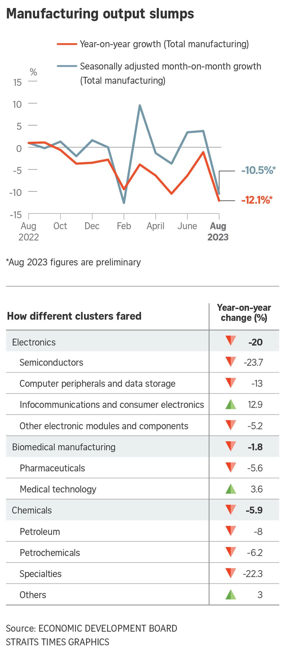 SINGAPORE - Singapore’s manufacturing output suffered its biggest drop since November 2019 as the key electronics industry reversed back into a slump in August.