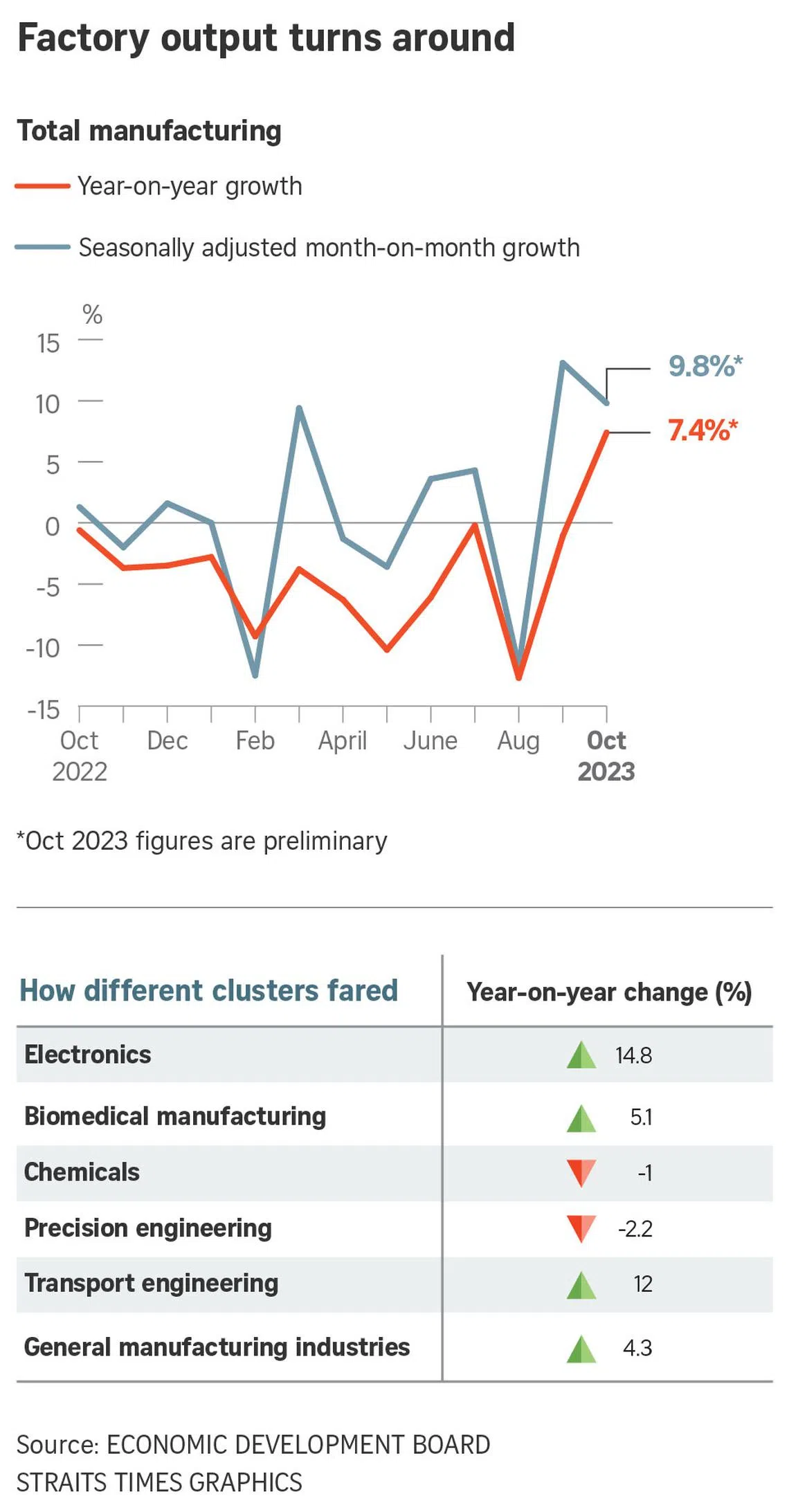 Total manufacturing production rose 7.4 per cent over the same month in 2022, after an upwardly revised 1.1 per cent drop in September, according to the Economic Development Board on Nov 24.