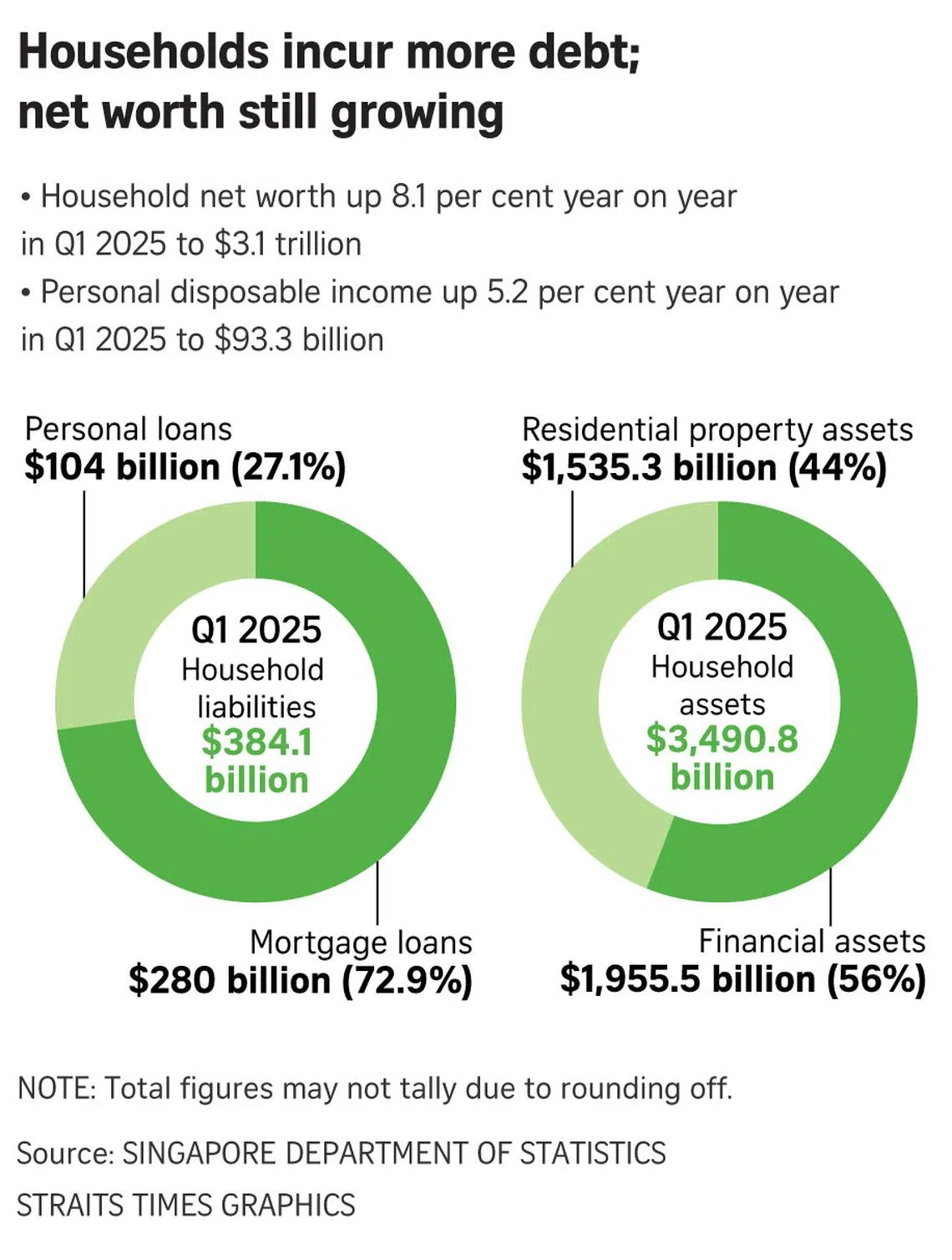 Household balance sheet numbers from the Singapore Department of Statistics (SingStat) on May 26 showed that liabilities grew for the sixth straight quarter, rising 5.2 per cent in the first quarter of 2025 from the same period a year ago to $384.1 billion.
