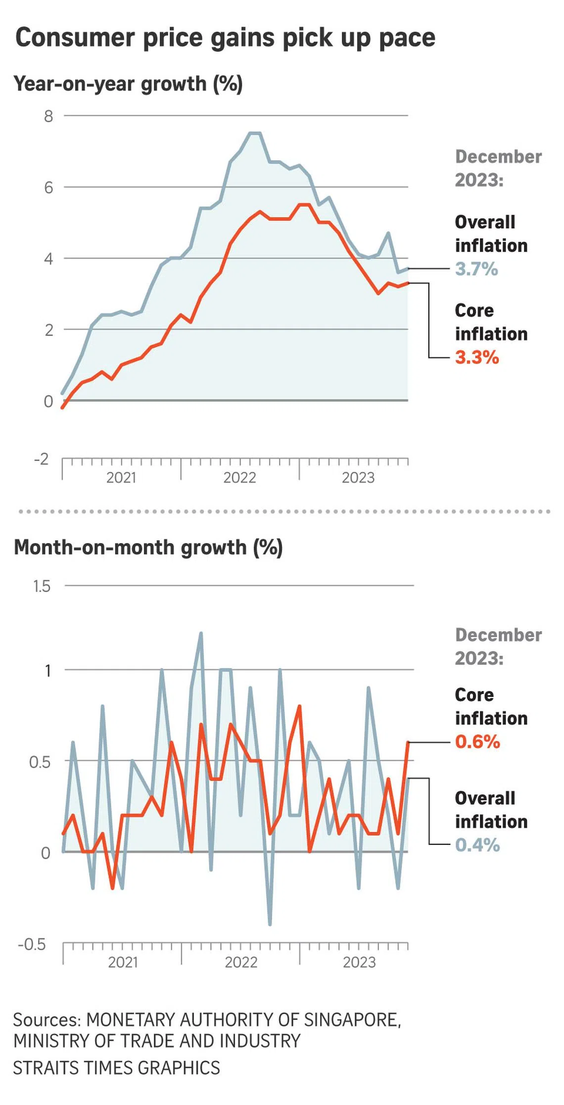 Singapore core consumer prices rise faster in December; overall inflation eases to 4.8% in 2023