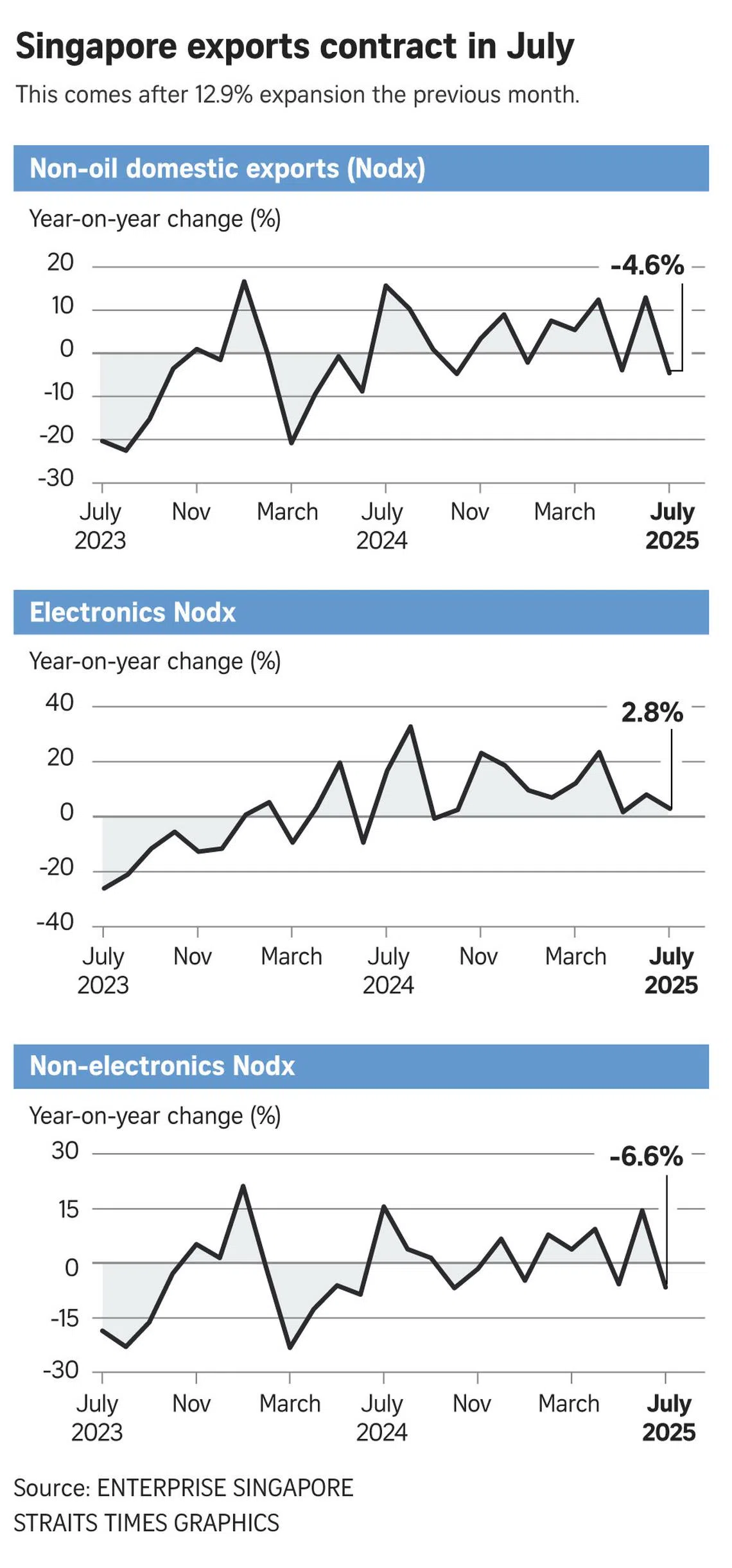 Non-oil domestic exports (Nodx) contracted 4.6 per cent in July from a year ago, after a revised 12.9 per cent expansion in June, data from Enterprise Singapore (EnterpriseSG) on Aug 18 showed.