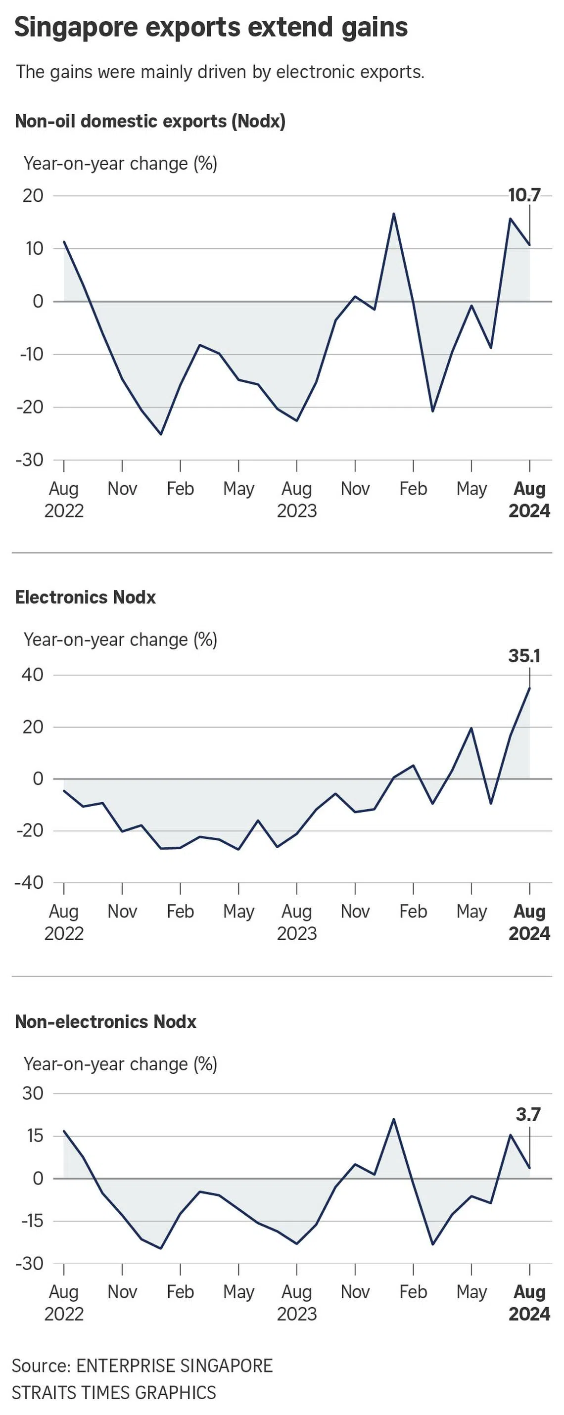 The gains were mainly driven by electronics even though non-electronics also increased, Enterprise Singapore (EnterpriseSG) noted in its Sept 17 statement.